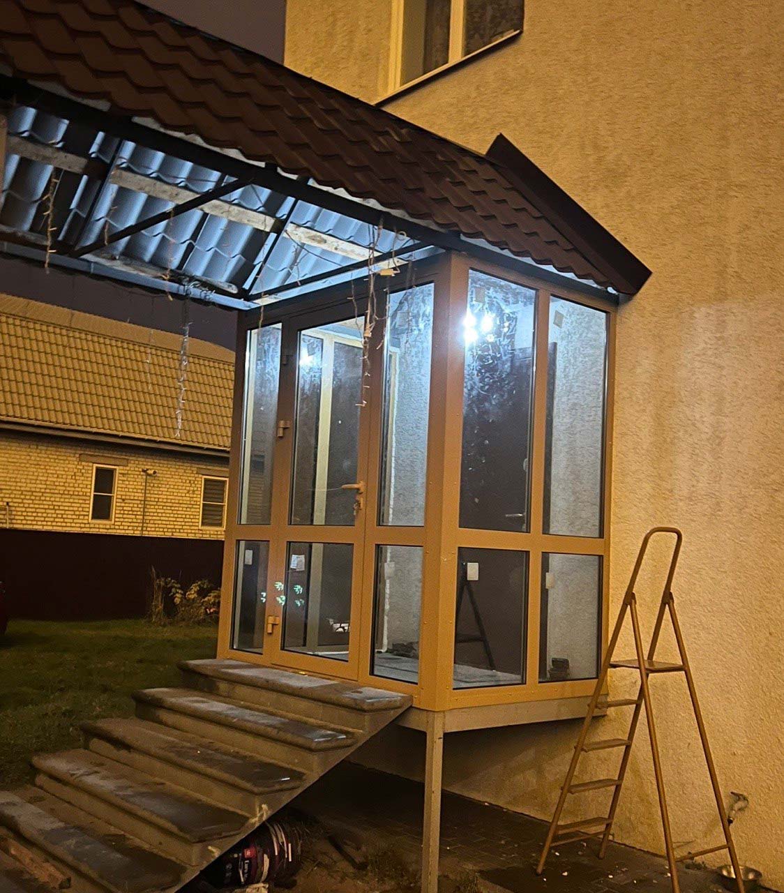 Остекление террасы. Константин подсказал раздвижные створки, получилось удобно. Работает чётко, по срокам уложились.